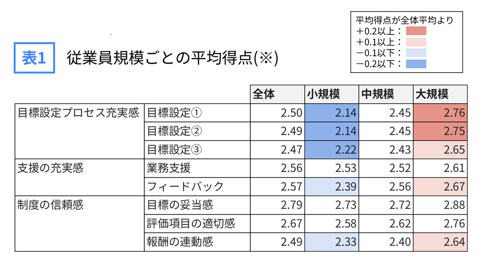 図5~7で用いた目標設定プロセス充実感・支援の充実感・制度に対する信頼感のそれぞれの指標を得点化し、従業員規模ごとの平均得点を表1の通り算出しました(算出方法はボックス内をご覧ください)。表1からは、多くの指標は小規模→中規模→大規模となるにつれ、平均得点が高くなっていることが分かります。先ほどの分析から納得感への影響が高いとされる「評価結果に対する上司からのフィードバック」や「報酬の連動感」もその傾向が見受けられます。