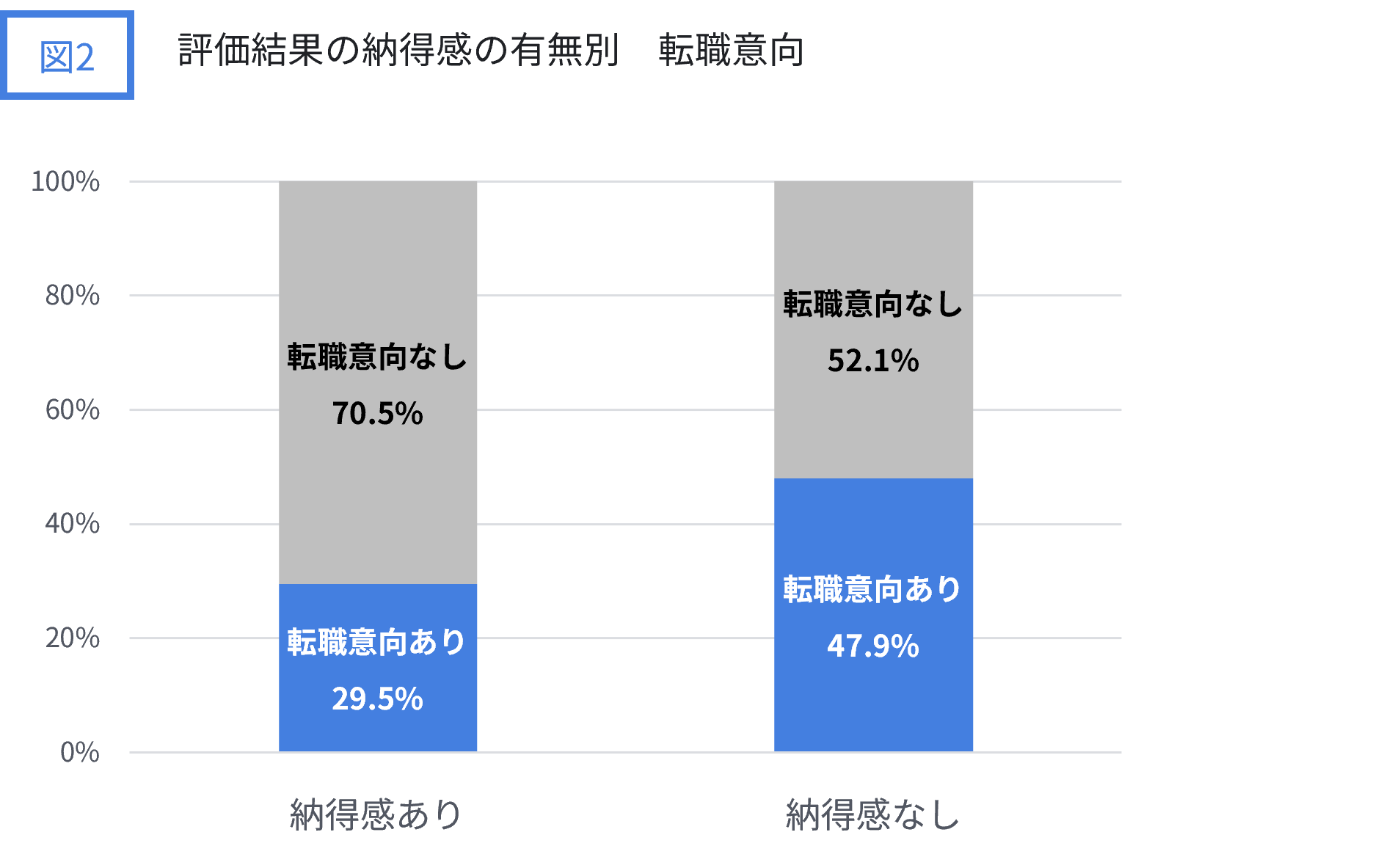この問いには様々な解があり得ますが、今回の調査では「転職意向」との関係を見てみます。「転職意向」は、評価結果に納得感がある回答者のうち29.5%が持っている一方で、納得感がない回答者では47.9%が持っています。この調査のみから因果関係は明らかにはできませんが、一般的には「評価結果の納得感が低い→転職意向が高まる」という関係が予想されます。また過去記事の「知っておきたい、人事評価の3つの現実 ~人事評価に関する調査結果より~」においては、人事評価の満足度が職場満足度に強く影響を与える可能性が示唆されており、納得感とはニュアンスがやや異なりますが、同様に職場満足度に影響する可能性も考えられます。