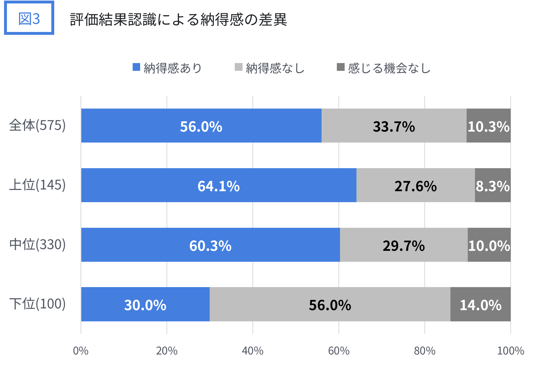素朴な感覚として「評価結果が良ければ納得感はあるし、悪ければ納得感がないというだけなのではないか」と思われる方もいらっしゃるかもしれません。そこで、直近の評価結果の受け止めが所属組織において上位と思っているか、もしくは中位、下位と思っているかによって回答者を3群に分け、納得感の差異を見た結果が図3です。