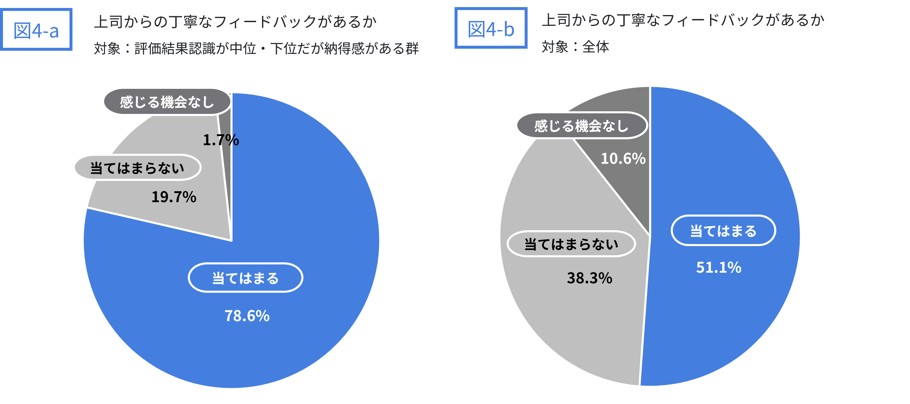 図4-aおよび図4-bを見比べると、評価結果認識が組織において中位・下位でも納得感がある人は、「最終的な評価結果について、上司から丁寧にフィードバックを受けられている」と感じている割合が高い傾向にあることが分かります。