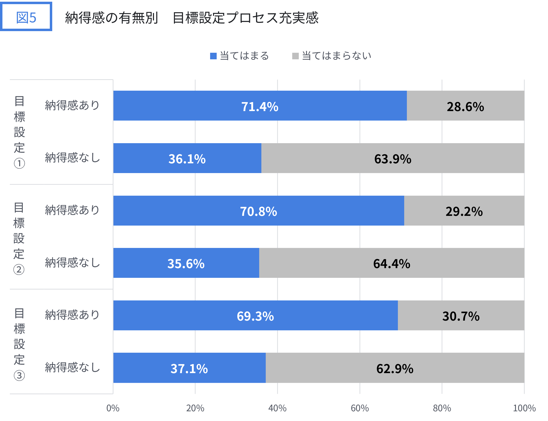 「当てはまる」の割合が、納得感なし群よりもあり群で、目標設定①は35.3pt、目標設定②は35.2pt、目標設定③は32.1pt高くなっています。