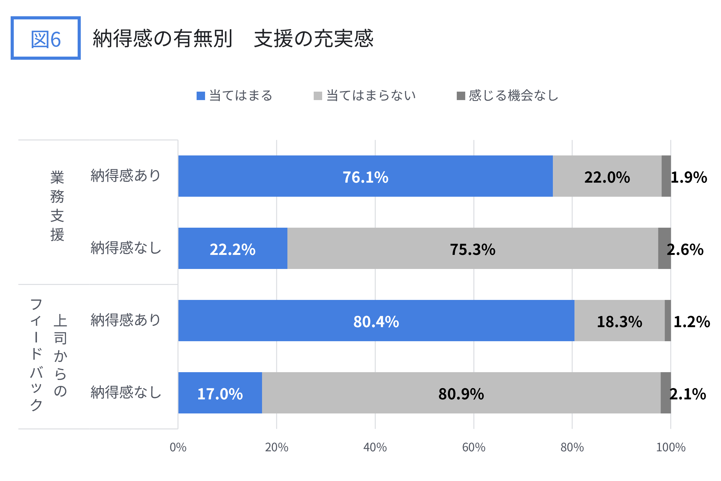 「当てはまる」の割合が、納得感なし群よりもあり群で、業務支援は53.9pt、上司からのフィードバックは63.4pt高くなっています。