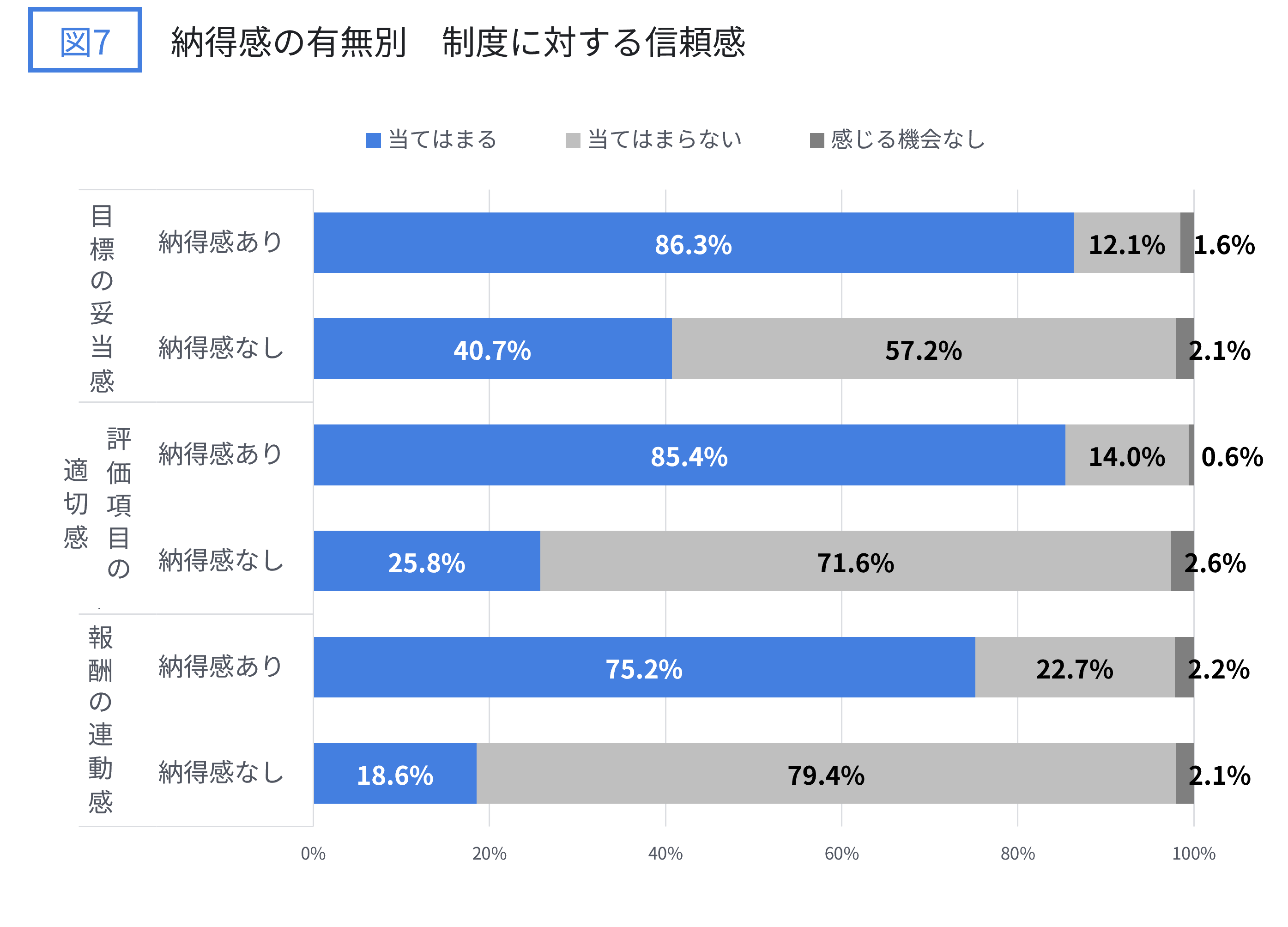 「当てはまる」の割合が、納得感なし群よりもあり群で、目標の妥当感は45.6pt、評価項目の適切感は59.6pt、報酬の連動感は56.6pt高くなっています。