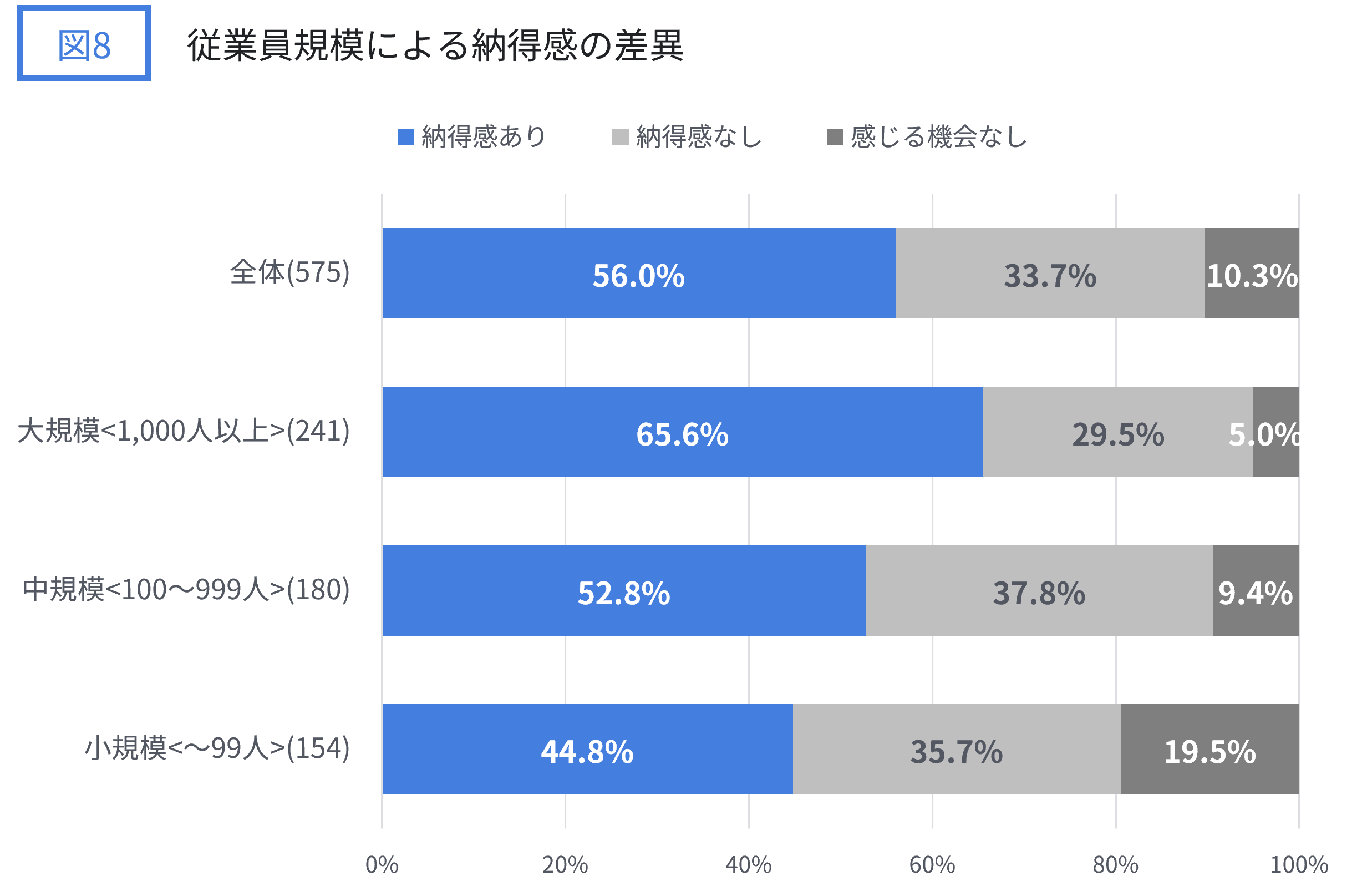 図8の通り、「納得感あり」が大規模(従業員数1,000人以上)では65.6%、中規模(従業員数100~999人)では52.8%、小規模(従業員数~99人)では44.8%となっており、従業員数が多い組織の方が、納得感のある人が多い傾向があります。