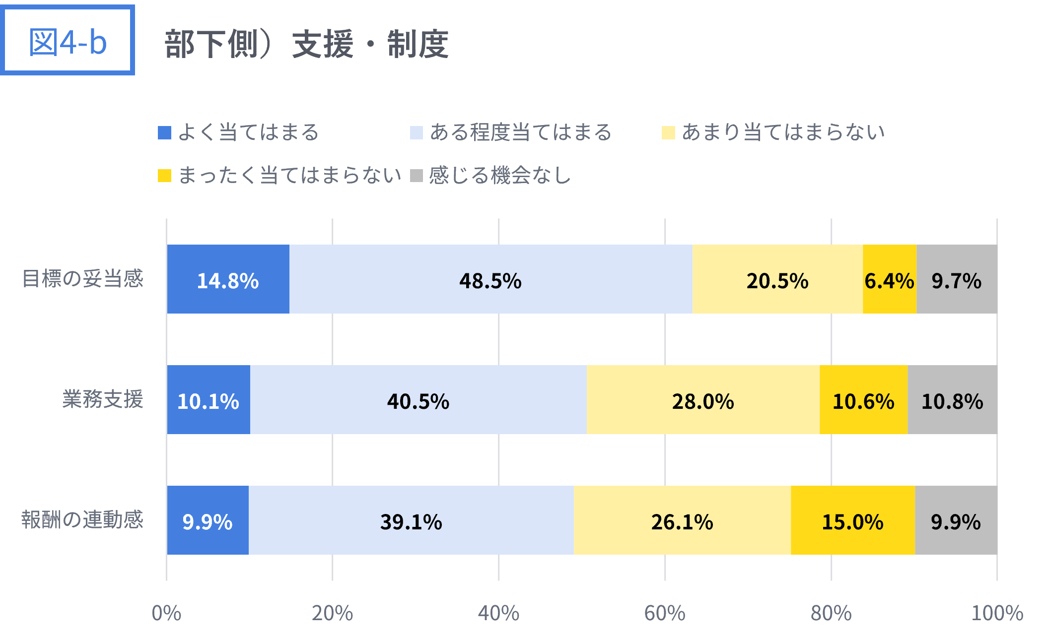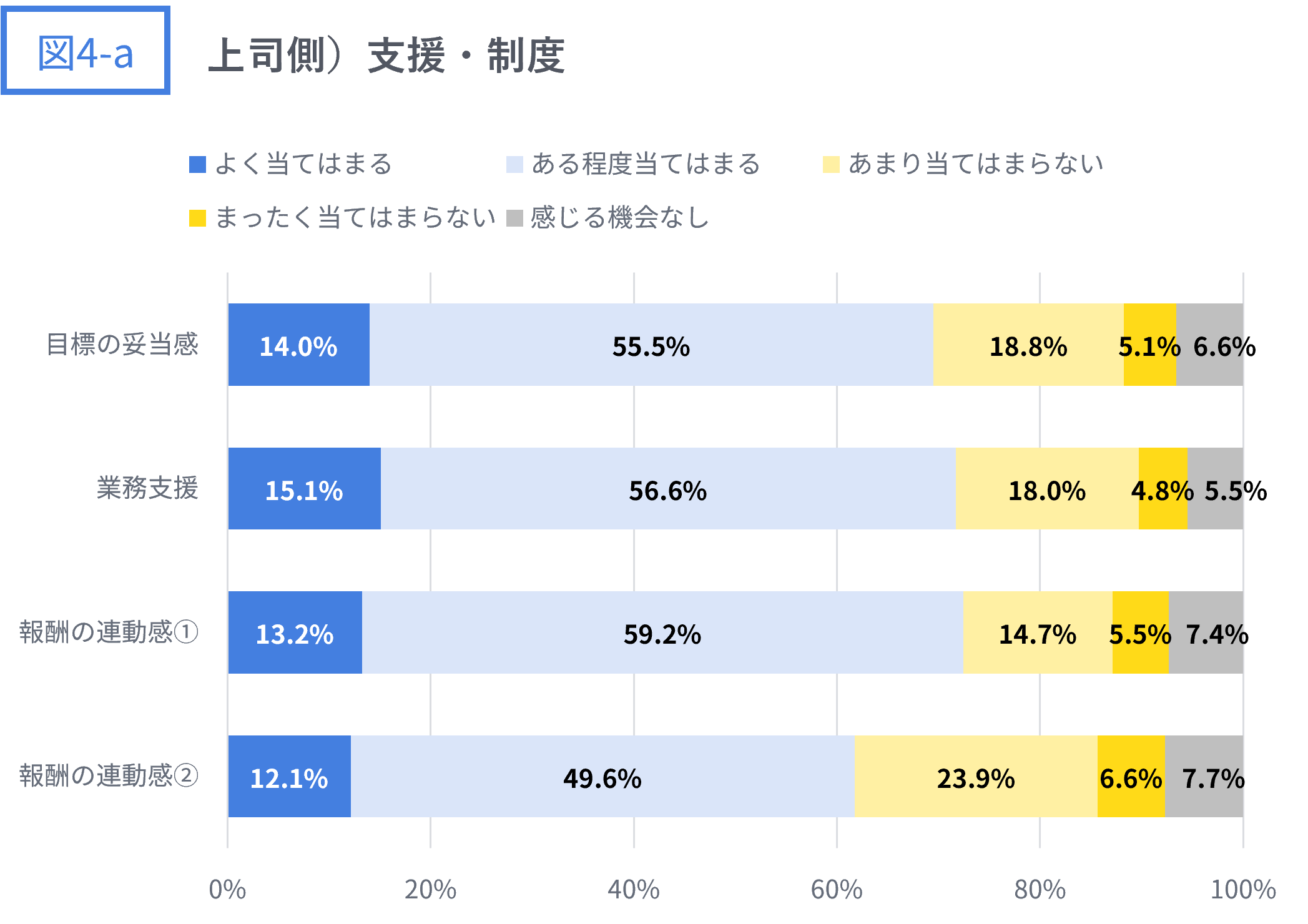 図3・図4を通じて、部下側の認識よりも、上司側の認識がやや甘い傾向にあることが分かりますが、立場上ある程度避けられない認識差と思われます。ただし上司・部下間で「当てはまる計(よく当てはまる+ある程度当てはまる)」の差が大きい項目として、「目標進捗確認(差分15.6pt)」「業務支援(差分21.1pt)」「報酬の連動感(上司①との差分が23.4pt)」となっています。このうち「業務支援」と「報酬の連動感」は、部下の評価結果に対する納得感にも強く影響を及ぼすと思われる項目であり、上司側が十分に業務支援や評価に見合った昇給ができていると考えていても、部下側はそうは思っておらず、評価結果への納得感を下げていることもあるかもしれません。