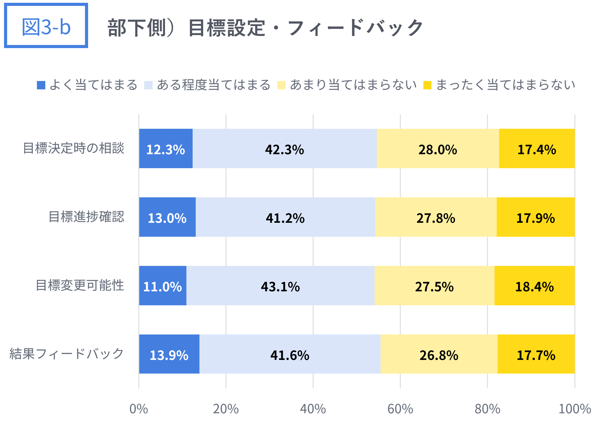 表側:期初の目標設定時には、部下と十分に相談をして目標を決めている/期中に部下の目標の進捗確認をする機会を十分に取れている/必要があれば、私の部下は期中に目標の変更ができる/評価結果に関して、部下に適切にフィードバックができている