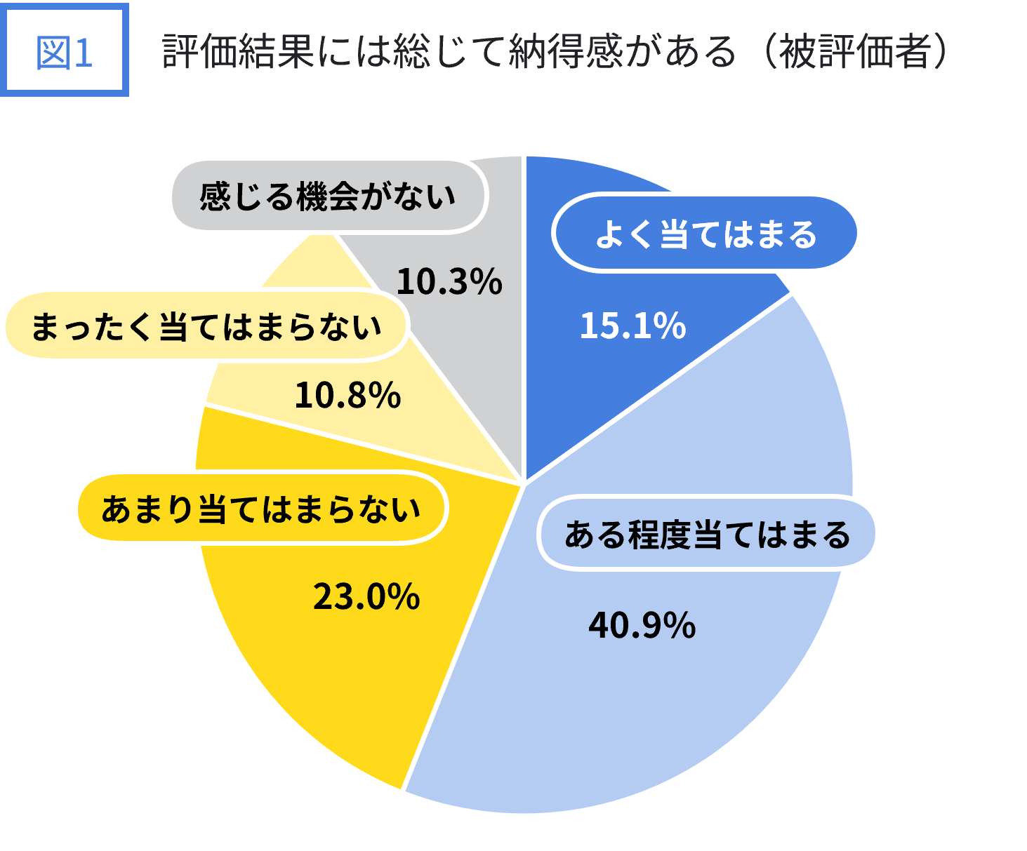 過去の記事「なぜ同じ人事評価でも納得できる人とできない人がいるのか -被評価者の納得感に関する調査-」から、被評価者の人事評価の評価結果の納得感のグラフを再掲します。被評価者の立場を持つ575名の回答者のうち「よく当てはまる(15.1%)」「ある程度当てはまる(40.9%)」を合わせた56.0%が「納得感がある」ようです。一方で、「あまり当てはまらない(23.0%)」「まったく当てはまらない(10.8%)」と合わせて33.7%の人は「納得感がない」ようです。回答者の勤め先によっては、評価制度がないというケースもあり得るため「そのように感じる機会がない(グラフ上では、感じる機会がない)」という選択肢も用意し、10.3%が本選択肢を選んでいます。