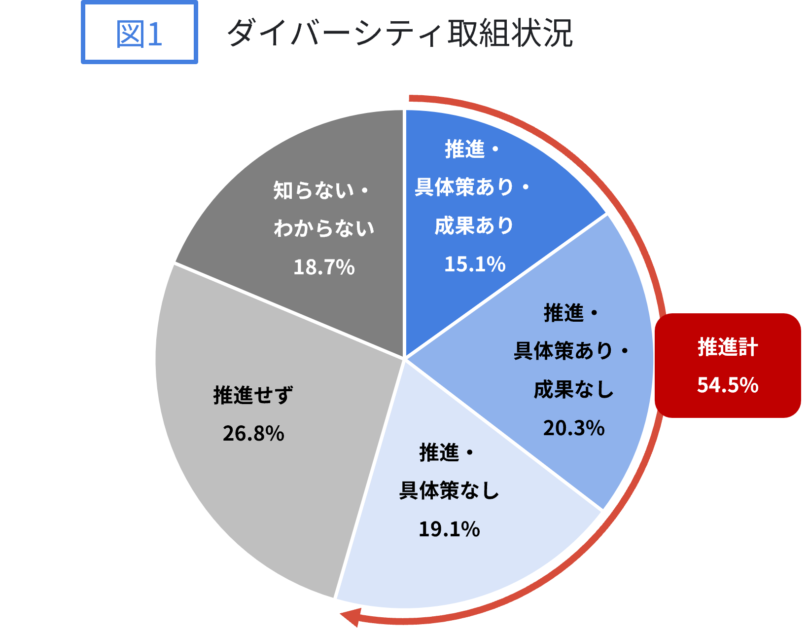 まず「推進しているか」という観点からは、54.5%の回答者が「推進している」と回答しました。一方で26.8%は「推進せず」という回答です。「知らない・わからない」の回答が18.7%ある中でも、「推進している」が過半数となりました。ただし推進していると回答した中には、具体策はないという回答が35.0%(全体の19.1%)、具体策はあるも成果はないという回答が37.2%(全体の20.3%)、具体策もあり成果もあるという回答が27.7%(全体の15.1%)となっており、推進度合にも濃淡があり、成果まで出ているのは全体の15%程度ということも分かります。