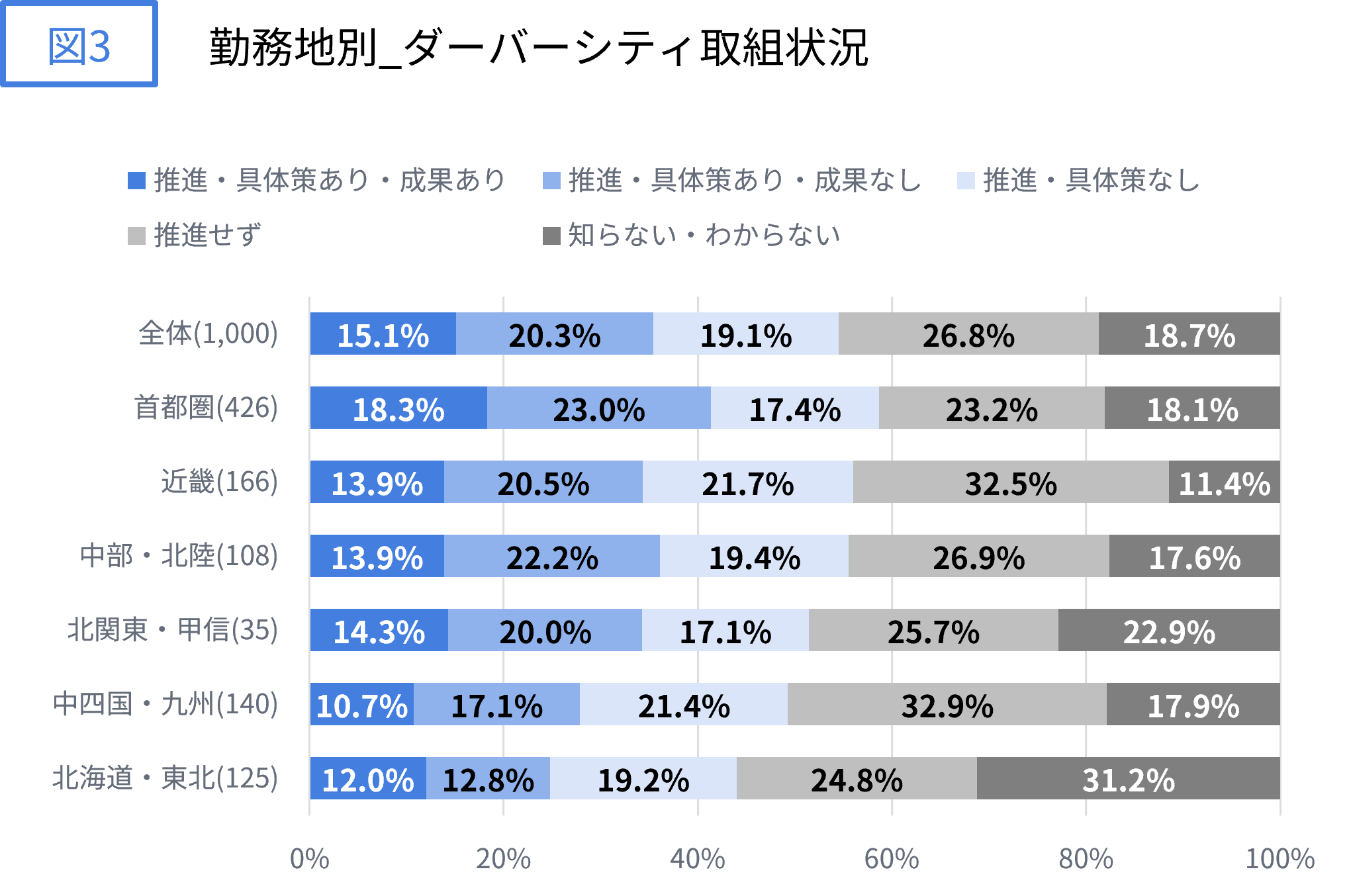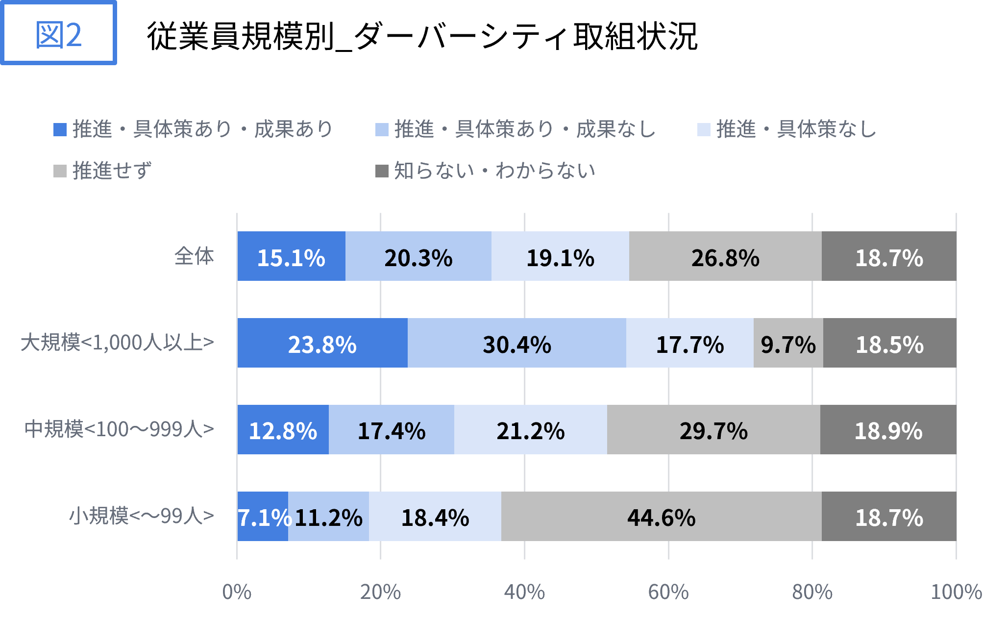 図2を見ると、大規模なほど推進基調にあるという回答が増えることが分かります。また推進基調にあるという回答の中でも、具体策がある・成果があるという回答も大規模なほど、増えています。結果的に、従業員数1,000人以上の企業・組織では「推進している」という回答が71.8%となり、推進している企業・組織の3割強(大規模組織全体のうちでは23.8%)が「具体策があり、成果も出ている」と回答しています。