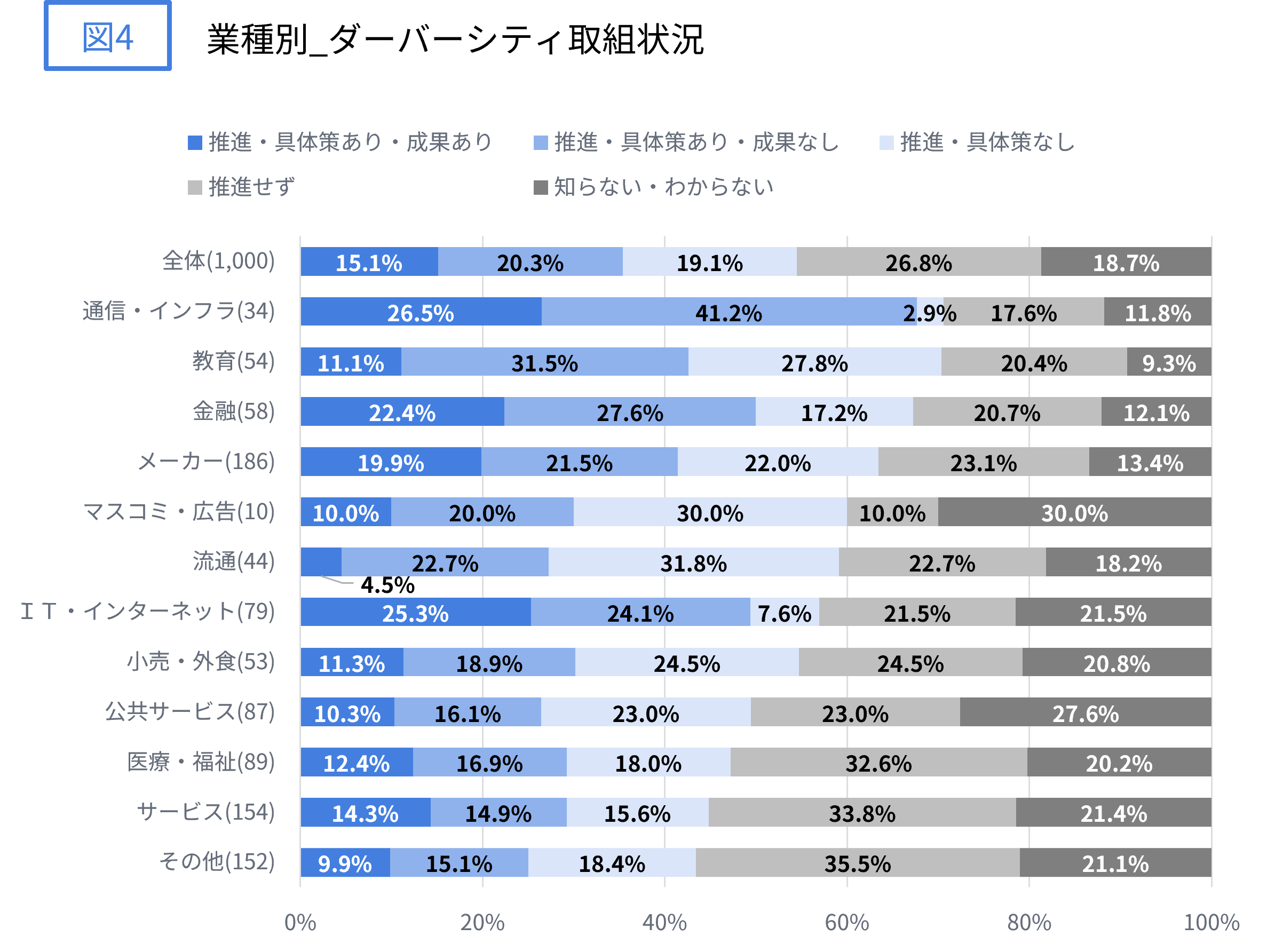 そのほかに勤務地(図3)や業種(図4)の区分でも、取組み状況を見ています。