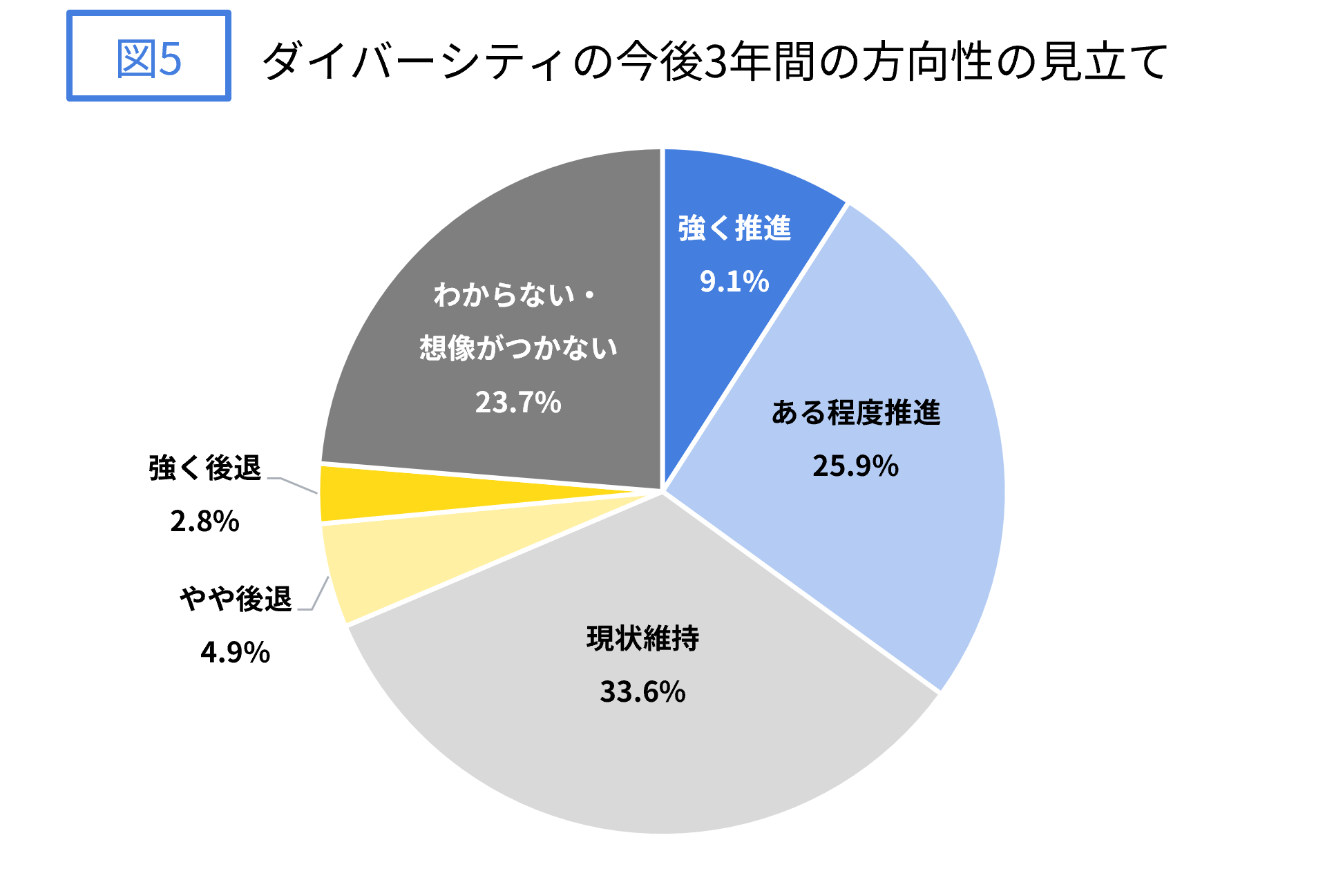 今後3年程度でダイバーシティは推進されると思うか、あるいは現状維持や後退と思うかを人事パーソンに聞いた結果が図5です。予測の設問のため「わからない・想像がつかない」という回答が23.7%と多くある中で、も推進計(強く推進+ある程度推進)が35.0%、現状維持が33.6%とそれぞれ3割程度となっています。後退計(強く後退+やや後退)は7.7%と大きな数値ではなく、揺り戻しが社会的に起きているとまでは言えないですが、少数とはいえ「後退が起こる」と考える人事パーソンは、どのような理由からそのような見立てをしているのか、着目したいポイントです。